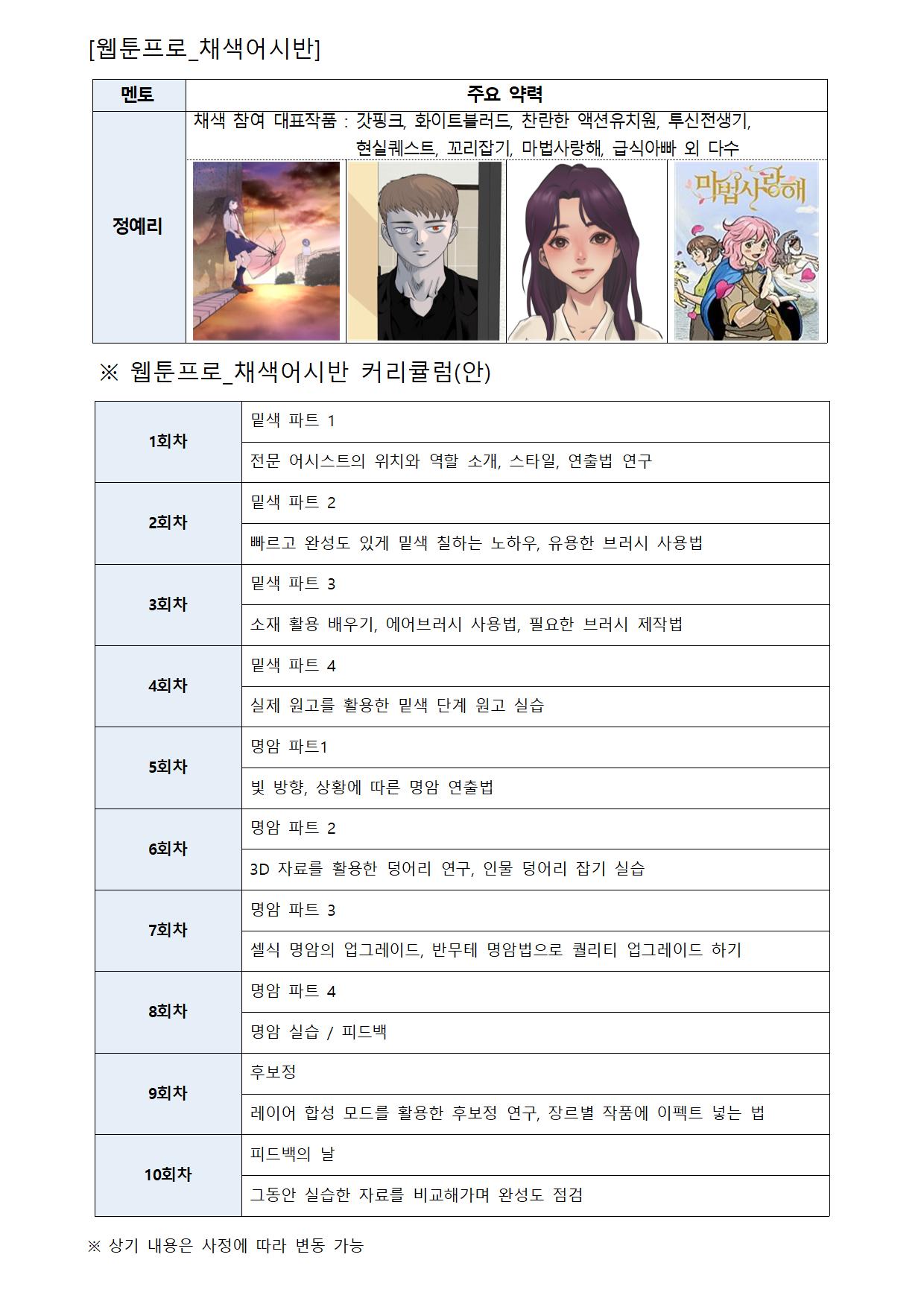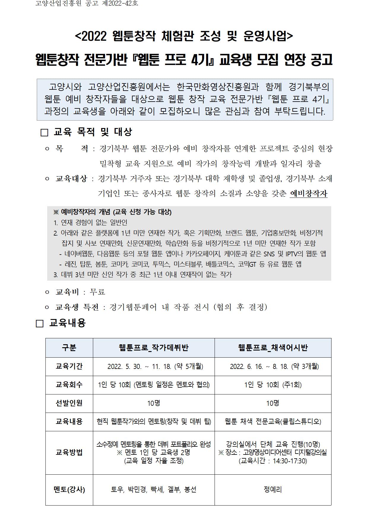 | 첨부파일 | 2022 웹툰프로 4기 교육생 모집 연장 공고문.hwp 2022 웹툰프로 4기 교육생(작가데뷔반 신청서).hwp 2022 웹툰프로 4기 교육생(채색어시반 신청서).hwp | ||