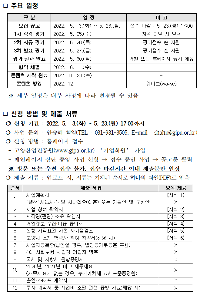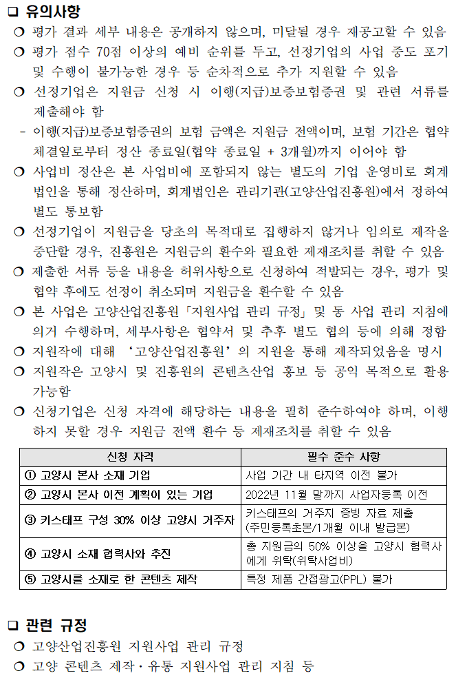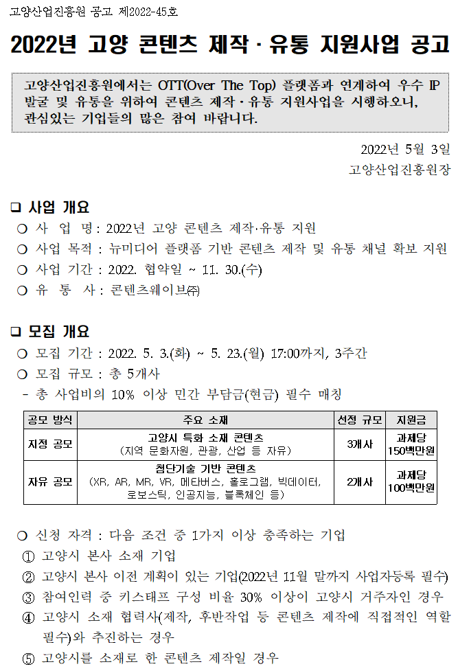 2022년 고양 콘텐츠 제작·유통 지원사업 공고문(신청서 양식 포함).hwp