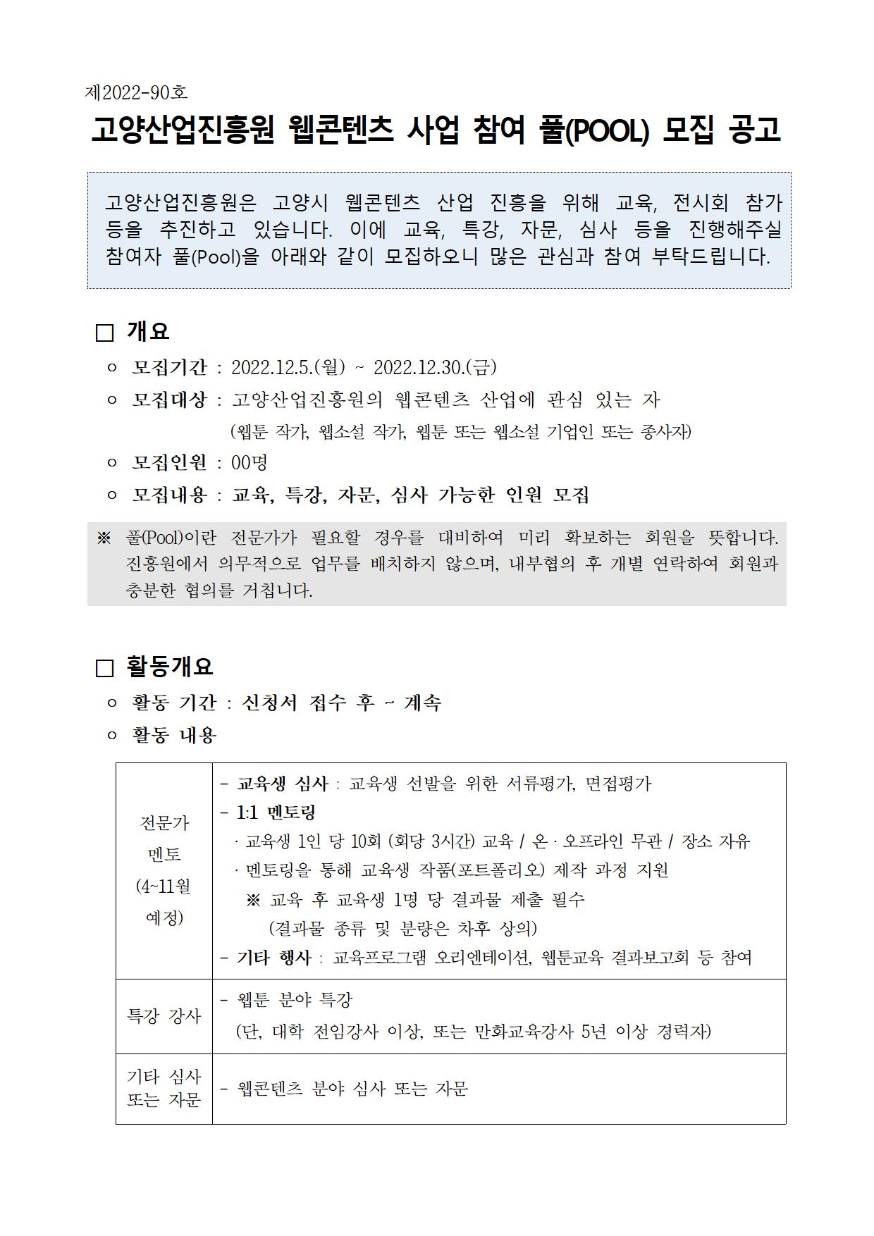 00. 고양산업진흥원 웹콘텐츠 사업 참여 풀(POOL) 모집 공고.hwp