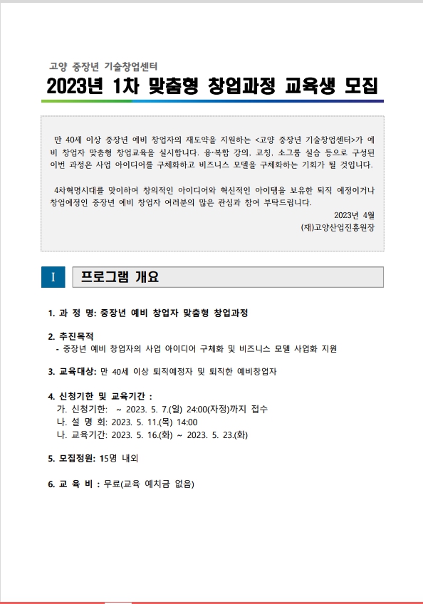 고양 중장년기술창업센터 2023년 1차 맞춤형 창업과정 교육생 모집