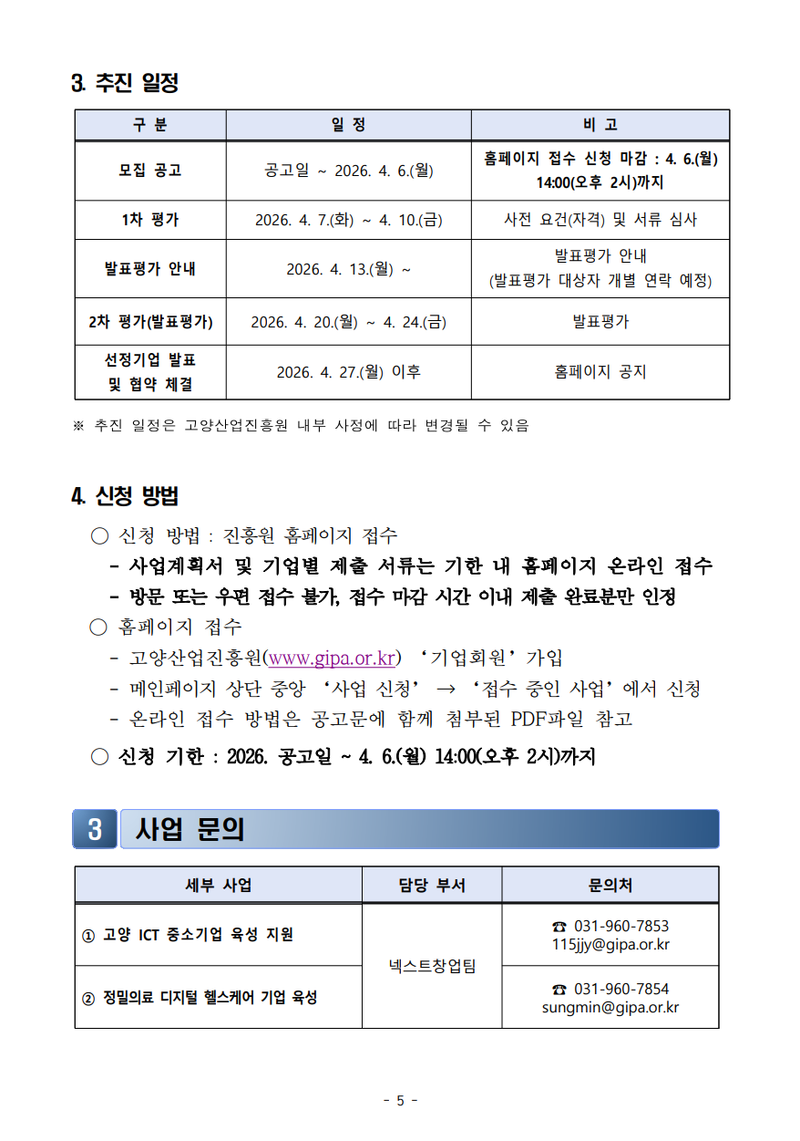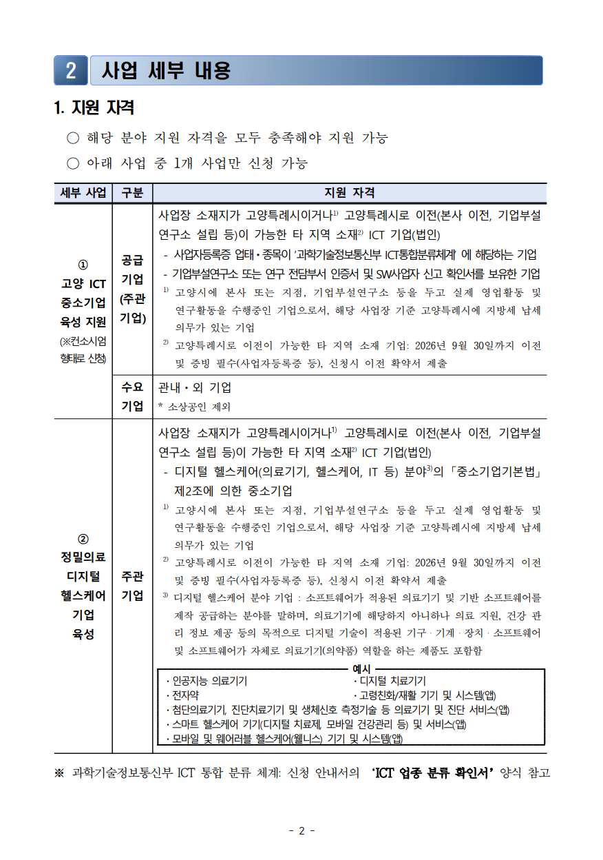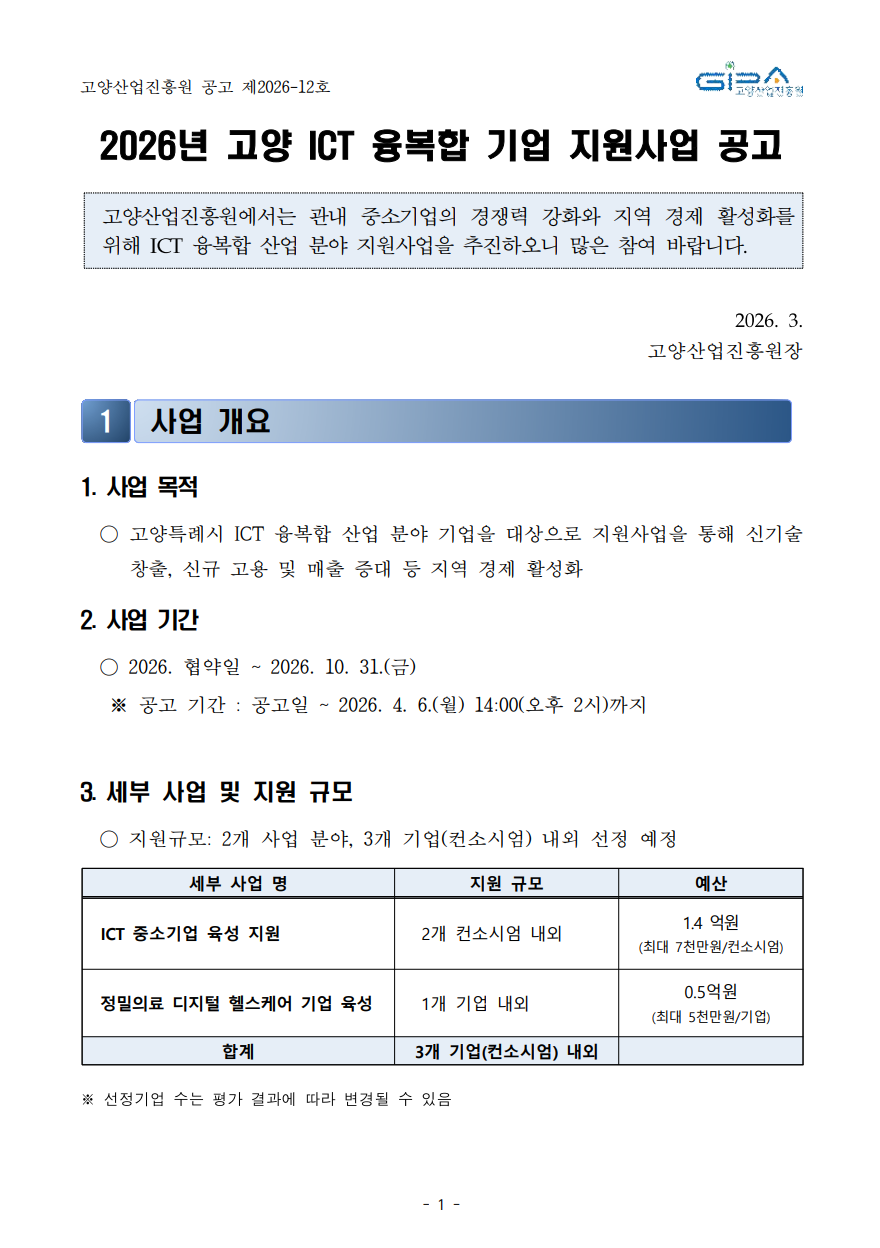 | 첨부파일 | 1. 공고문(2026년 ICT 융복합 기업 지원사업 공고.pdf 2-1. 신청 안내서_2026년 고양 ICT 중소기업 육성 지원사업(양식 포함).hwp 2-2. 신청 안내서_2026년 정밀의료 디지털 헬스케어 기업 육성(양식 포함).hwp 3-1. 관리지침_2026년 고양 ICT 중소기업 육성 지원 사업.hwp 3-2. 관리지침_2026년 정밀의료 디지털 헬스케어 기업 육성.hwp 4. (참고자료) 홈페이지 신청 매뉴얼.pdf | ||