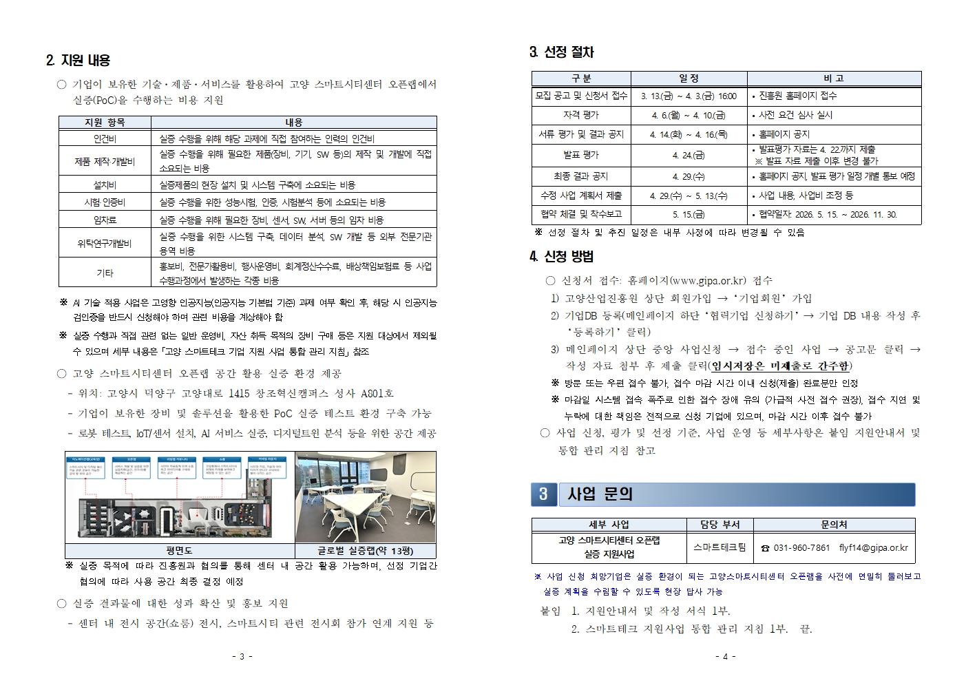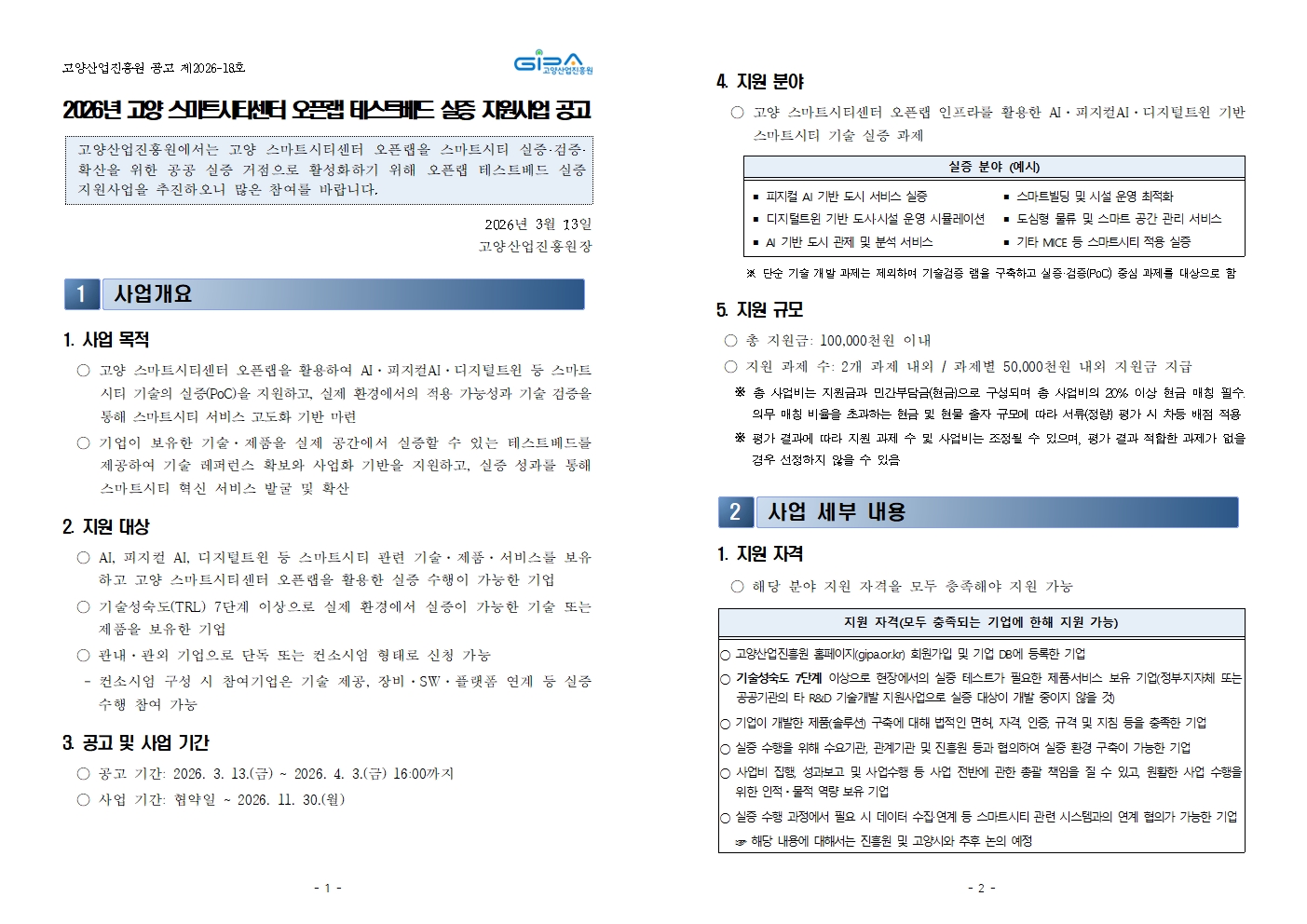| 첨부파일 | 붙임1. 공고문_고양 스마트시티 센터 오픈랩 테스트베드 실증 지원 사업.hwp 붙임2. 지원안내서_고양 스마트시티 센터 오픈랩 테스트베드 실증 지원 사업.hwp 붙임3. 2026년 고양 스마트테크 지원 사업 통합 관리 지침(2026.3.13.).hwp 붙임4. 기업 DB 등록방법.pdf 붙임5. 기술성숙도(TRL) 설명.pdf 붙임6. 고양산업진흥원 홈페이지 접수 매뉴얼.zip | ||