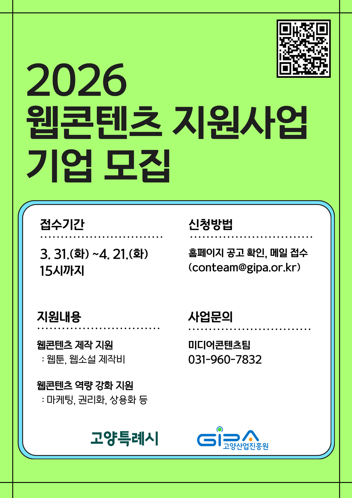 | 첨부파일 | 공고문_2026년 웹콘텐츠 지원사업.pdf 신청양식_2026년 웹콘텐츠 제작 지원사업.hwp 신청양식_2026년 웹콘텐츠 역량 강화 지원사업.hwp 사업 관리 지침_2026년 웹콘텐츠 제작 지원사업.pdf 사업 관리 지침_2026년 웹콘텐츠 역량 강화 지원사업.pdf 참고_콘텐츠산업 특수분류표.pdf | ||
