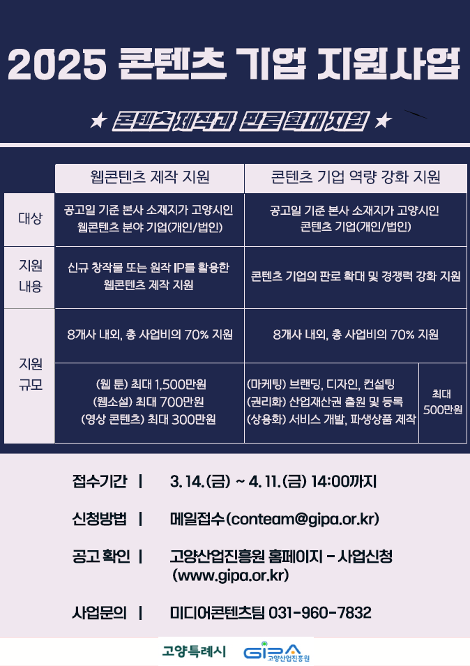 | 사업기간 | 0000-00-00 ~ 0000-00-00 | 접수기간 | 2025-03-14 ~ 2025-04-11 |