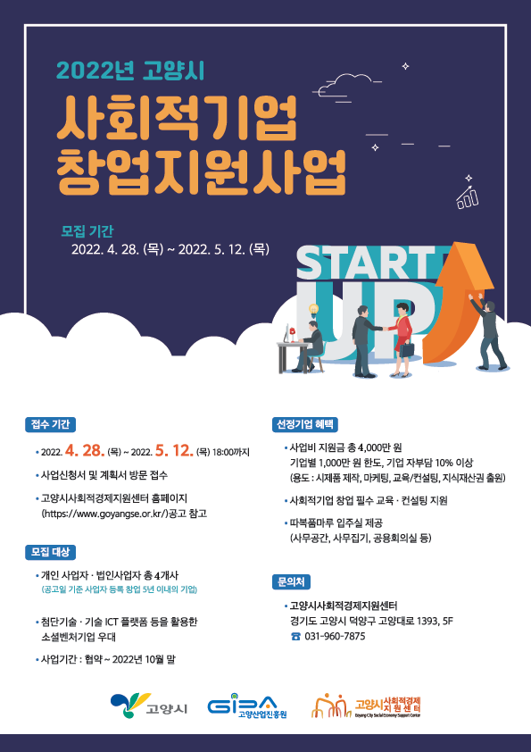 | 첨부파일 | 2022년 고양시 사회적기업 창업지원사업 공고문(추가모집 22.04.).pdf 01.2022년 고양시 사회적기업 창업지원사업 신청서식(추가모집 22.04.).hwp 창업지원포스터_추가모집_웹_.png | ||