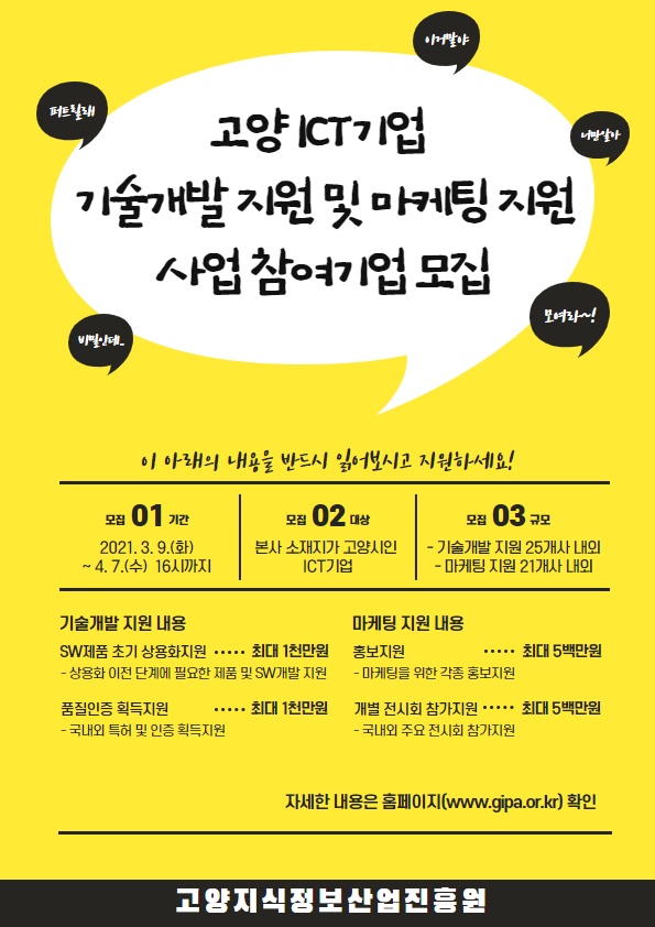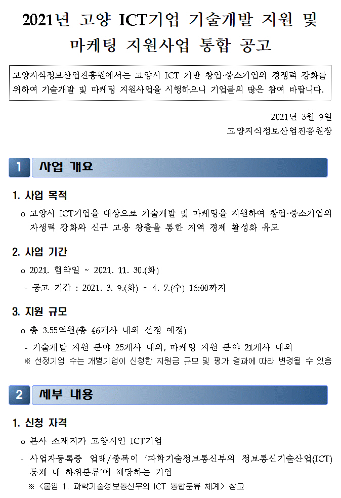 2021년 고양 ICT기업 기술개발 지원 및 마케팅 지원사업 통합 공고