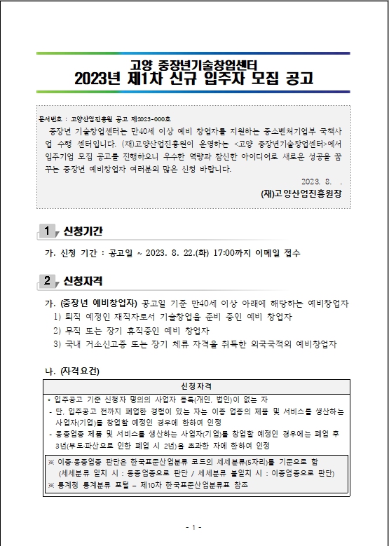 고양 중장년기술창업센터 2023년 제1차 신규 입주자 모집