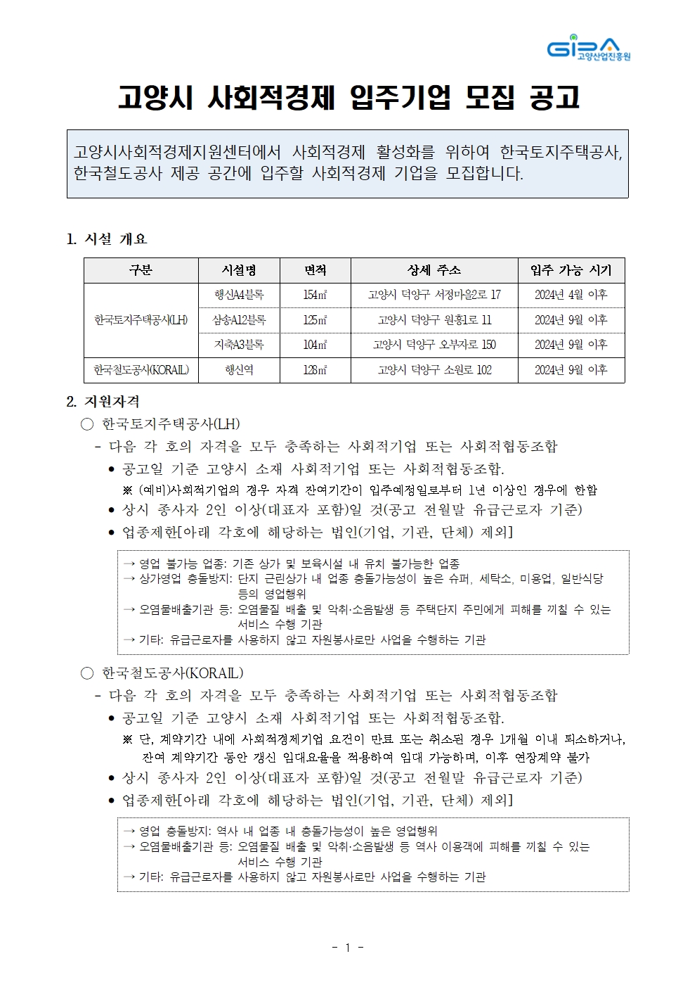 고양시 사회적경제 입주기업 2차 모집공고