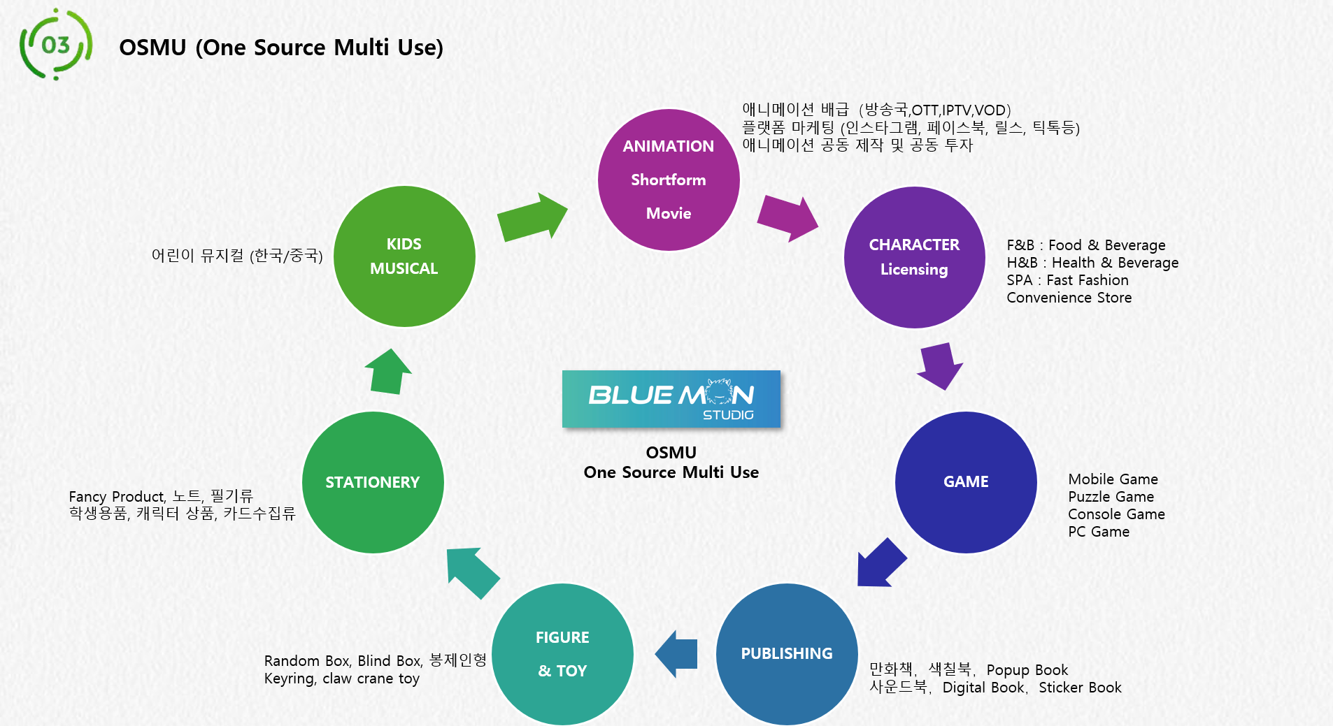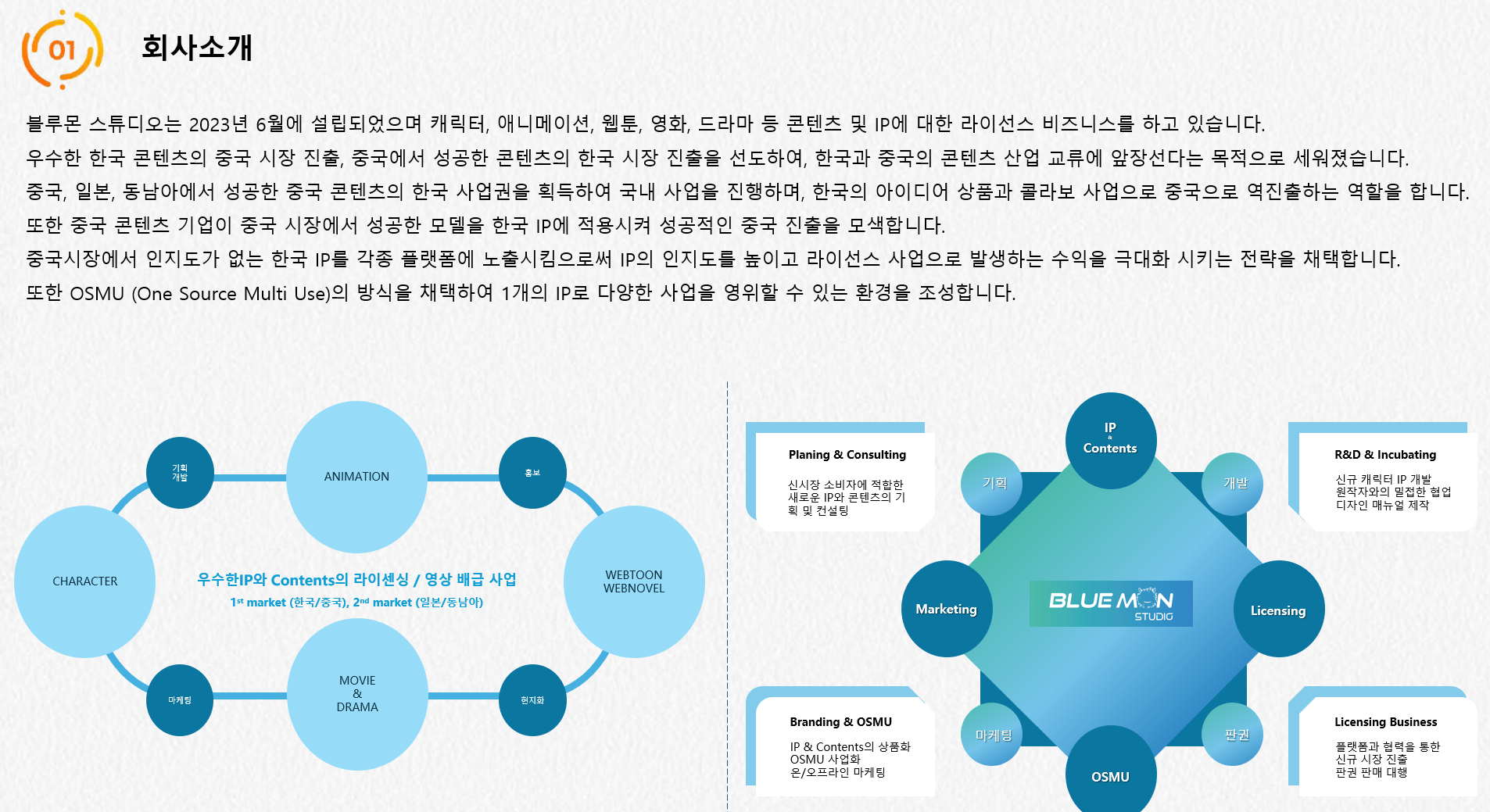 블루몬 스튜디오는 2023년 6월에 설립되었으며 캐릭터, 애니메이션, 웹툰, 영화, 드라마 등 콘텐츠 및 IP에 대한 라이선스 비즈니스를 하고 있습니다. 우수한 한국 콘텐츠의 중국 시장 진출, 중국에서 성공한 콘텐츠의 한국 시장 진출을 선도하여, 한국과 중국의 콘텐츠 산업 교류에 앞장선다는 목적으로 세워졌습니다. 중국, 일본, 동남아에서 성공한 중국 콘텐츠의 한국 사업권을 획득하여 국내 사업을 진행하며, 한국의 아이디어 상품과 콜라보 사업으로 중국으로 역진출하는 역할을 합니다. 또한 중국 콘텐츠 기업이 중국 시장에서 성공한 모델을 한국 IP에 적용시켜 성공적인 중국 진출을 모색합니다. 중국시장에서 인지도가 없는 한국 IP를 각종 플랫폼에 노출시킴으로써 IP의 인지도를 높이고 라이선스 사업으로 발생하는 수익을 극대화 시키는 전략을 채택합니다. 또한 OSMU (One Source Multi Use)의 방식을 채택하여 1개의 IP로 다양한 사업을 영위할 수 있는 환경을 조성합니다.