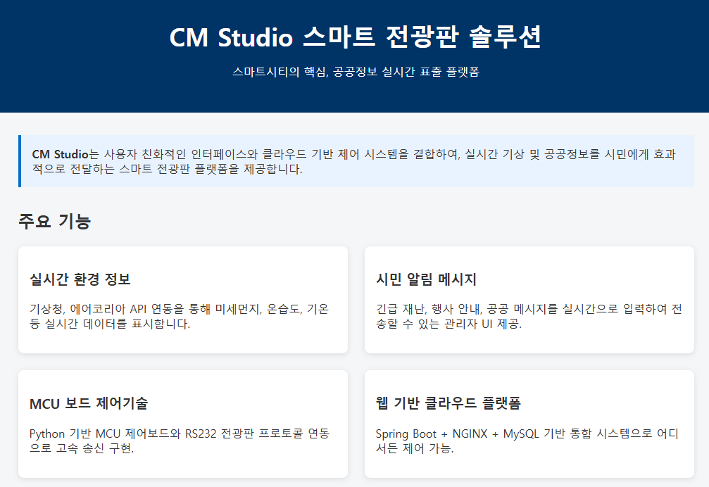 씨엠스튜디오는 ICT 기술을 기반으로 스마트시티 서비스 및 IoT 시스템을 개발하는 전문기업으로, 사용자 중심의 인터페이스 설계와 통합제어시스템 구축에 강점을 보유하고 있습니다. 다양한 공공기관 및 지자체 대상 LED 전광판 제어, 환경정보 수집·표출 시스템, 통합 대시보드 및 클라우드 기반 모니터링 서비스를 자체 개발하고 운영하고 있으며,특히 도시 내 시민 편의를 향상시키는 실시간 공공정보 전달 솔루션에서 우수한 실적과 기술력을 갖추고 있습니다. 주요 개발 역량으로는 다음과 같습니다. - Spring Boot 기반 스마트 플랫폼 서버 개발 - NGINX, MySQL, Ubuntu 기반 클라우드 인프라 구축 및 운영 - Python 기반 MCU 통합제어보드 연동 및 메시지 처리 - LED 전광판 프로토콜(M10 Board) 연동 시스템 설계 - 공공 API(AirKorea, 기상청) 수집 및 실시간 가공 표시 기술 IoT 센서 연동 및 LTE 통신 모듈 제어 기술 보유 ㈜씨엠스튜디오는 이러한 기반 기술과 실증 경험을 토대로, 금번 고양 스마트시티 리빙랩 실증사업을 통해 시민 중심의 공공안내체계 고도화와 지역 맞춤형 실시간 정보 전달 인프라를 구현하고자 합니다.