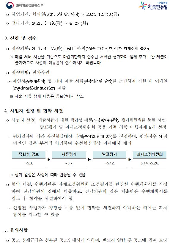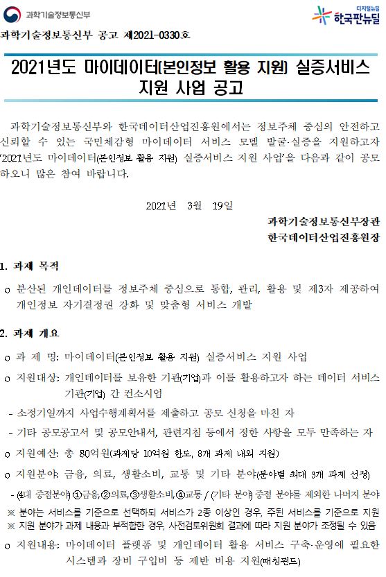 [유관기관] 한국데이터산업진흥원 2021년 마이데이터(본인정보 활용 지원) 실증서비스 지원 사업(~ 4/27)