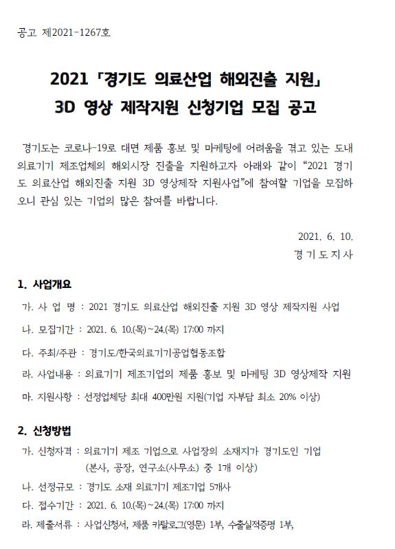 [유관기관] 2021년 경기도 의료산업 해외진출 지원 3D 영상제작 지원사업 (~6/24)