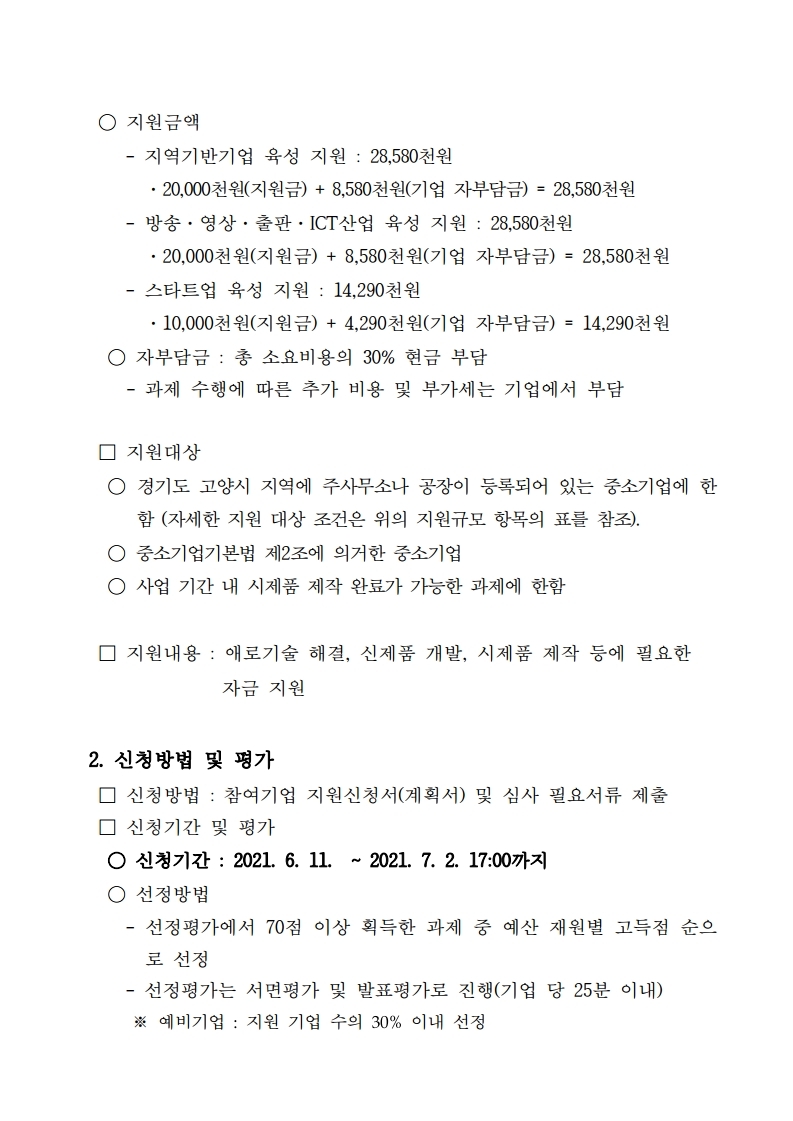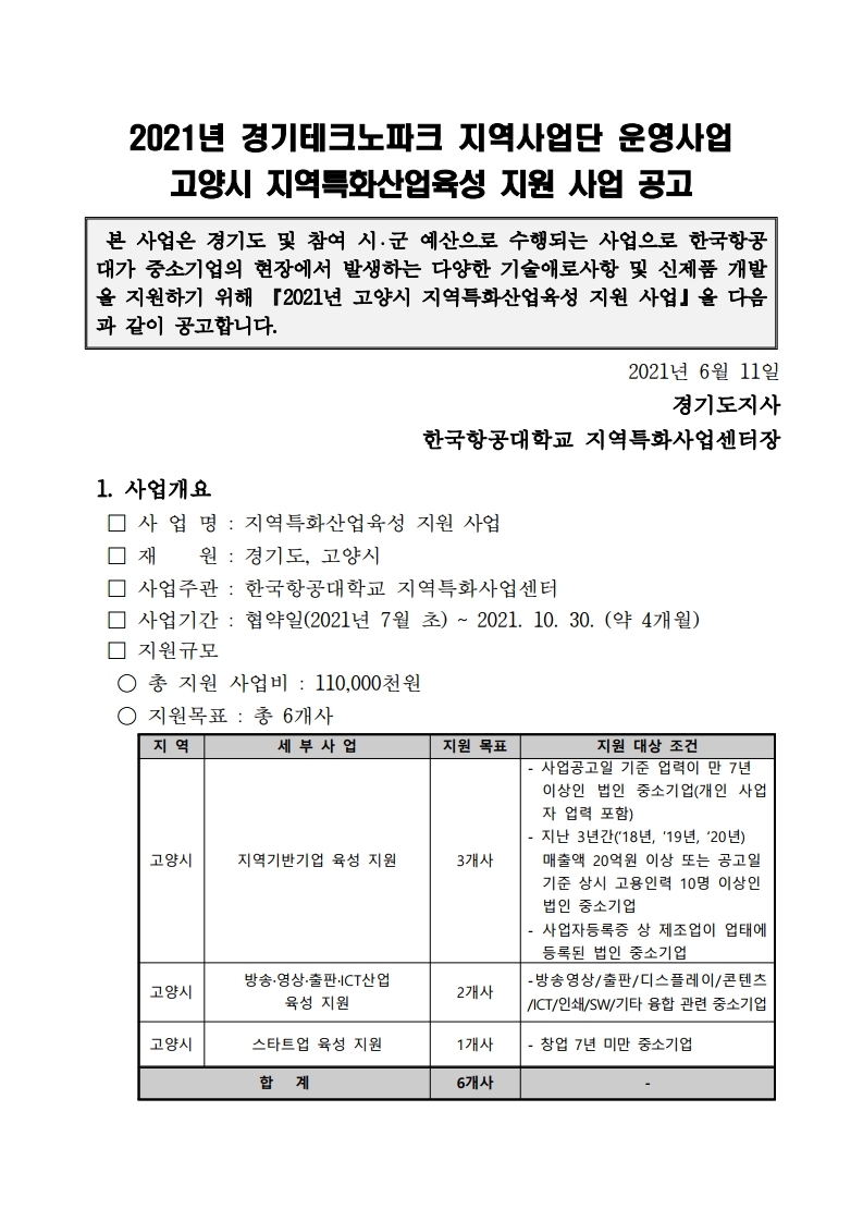[유관기관] 2021년 경기테크노파크 지역사업단 운영사업 고양시 지역특화산업육성 지원 사업 공고