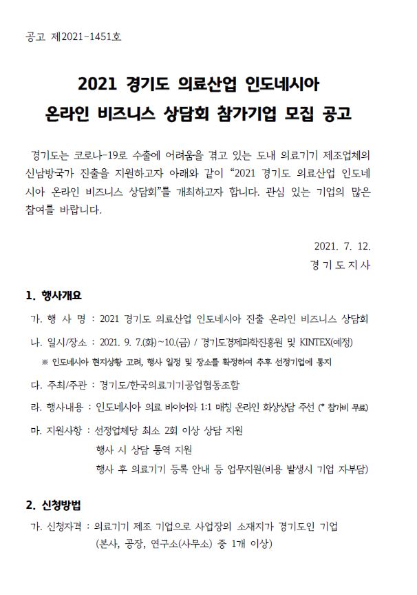 [유관기관] 2021 경기도 의료산업 인도네시아 온라인 비즈니스 상담회 참가기업 모집 공고 (~7/23 금, 17시)