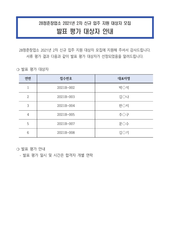 [일반] [28청춘창업소] 2021년도 2차 신규 입주 모집 발표 평가 대상자 알림