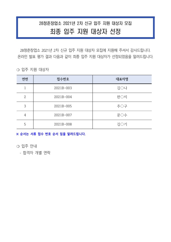 [일반] [28청춘창업소] 2021년도 2차 신규 입주 모집 선정 결과 알림