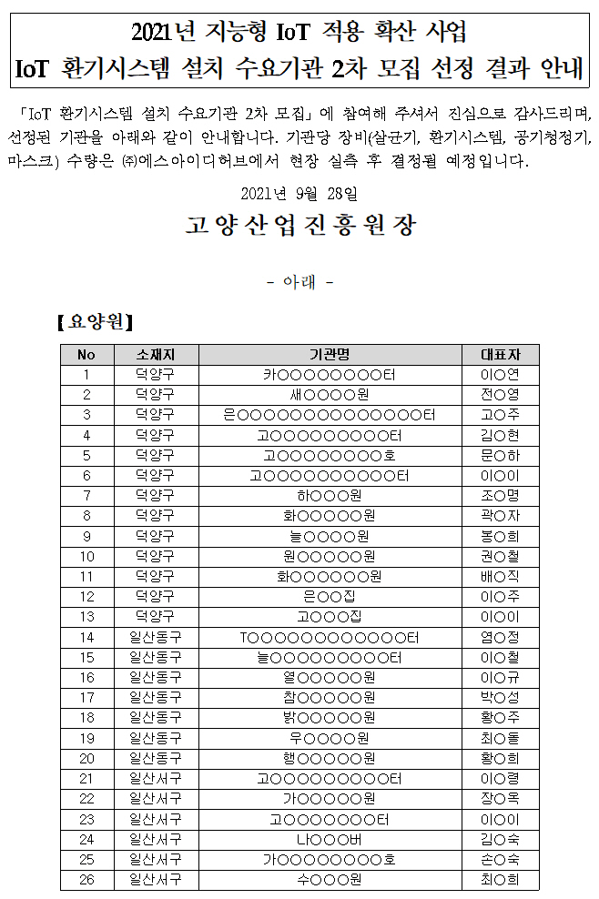 [일반] [2021년 지능형 IoT 적용 확산 사업] IoT 환기시스템 설치 수요기관 2차 모집 선정 결과 안내