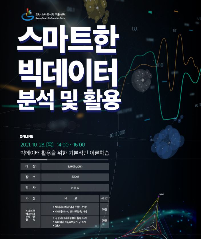 고양 스마트시티 지원센터에서 스마트한 빅데이터 분석 및 활용 온라인 교육 참가자를 모집합니다.