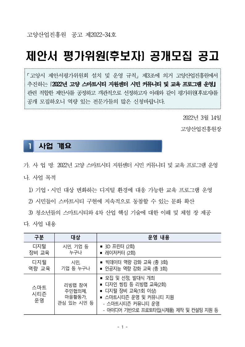 [일반] 평가위원 모집 공고_2022년 고양 스마트시티 지원센터 교육 프로그램 용역사 선정 평가위원 모집