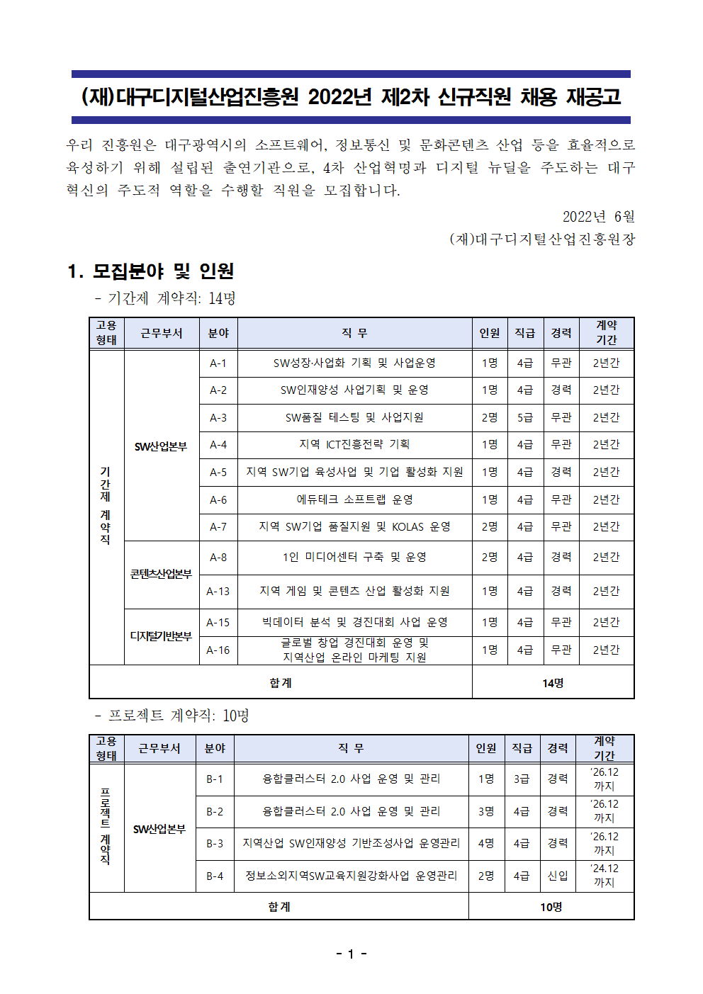 (붙임2) 직무기술서_대구디지털산업진흥원 2022년 제2차 신규직원 채용 재공고.hwp