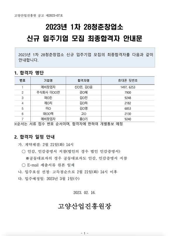 [일반] 2023년 1차 28청춘창업소 신규 입주기업 모집 최종 합격자 공고