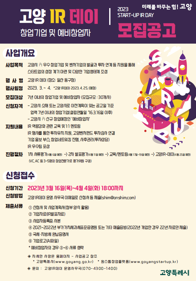 본 공고는 고양특례시에서 게시한 공고로, 관련 문의는 고양 IR데이 운영사무국(070-4300-1400)으로 문의 바랍니다.