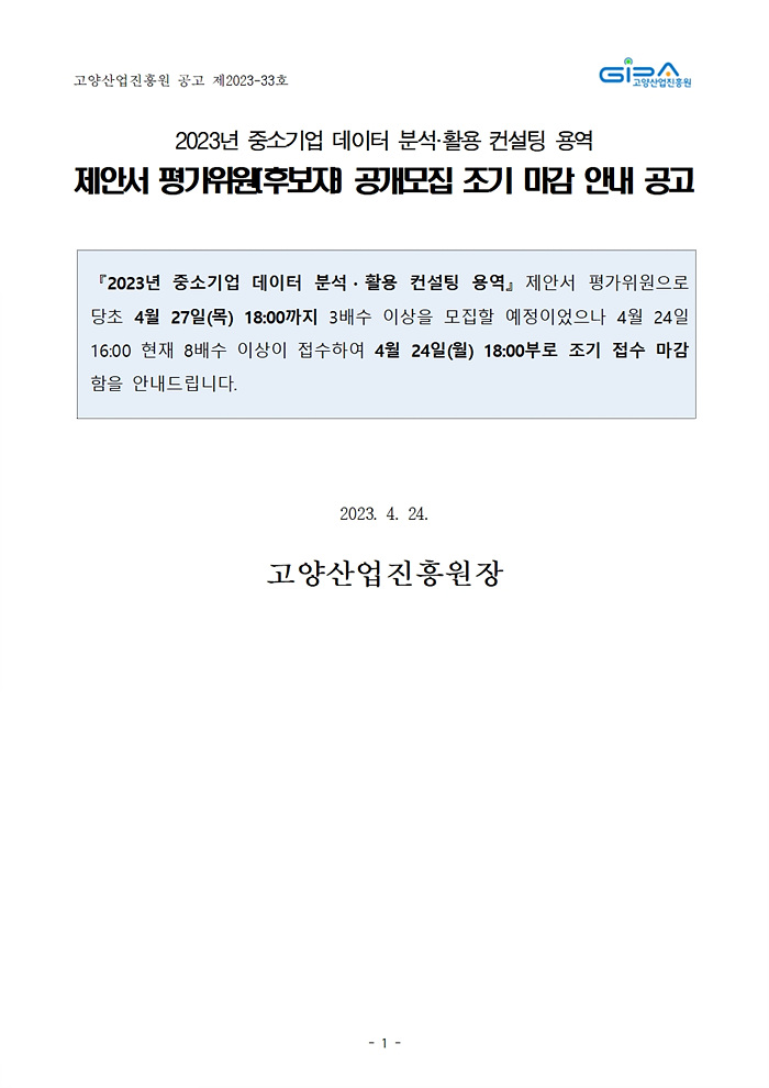 [일반] [조기마감]2023년 중소기업 데이터 분석·활용 컨설팅 용역 제안서 평가위원 공개모집 공고 안내문