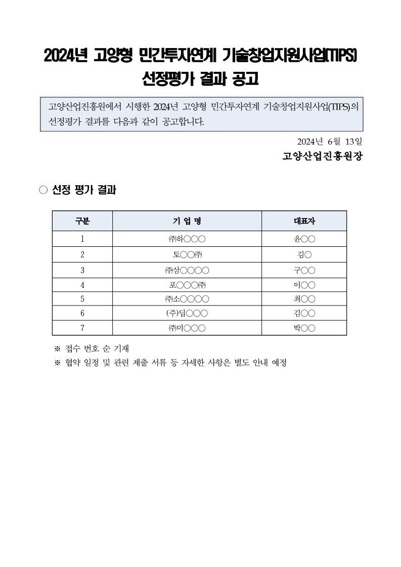 [일반] 2024년 고양형 민간투자연계 기술창업지원사업 선정평가 결과 공고