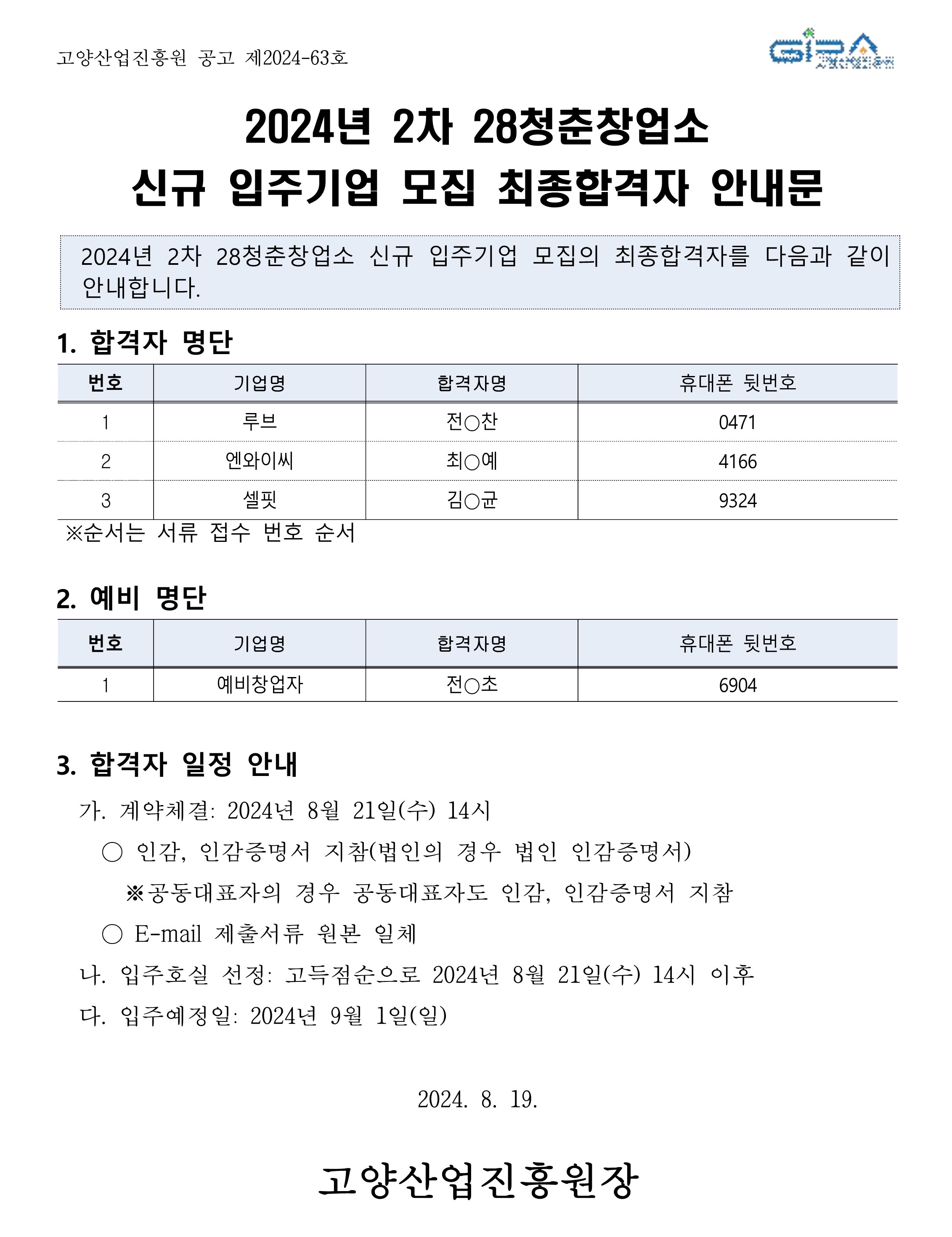 [일반] 2024년 2차 28청춘창업소 신규입주기업 모집 최종합격자 안내문