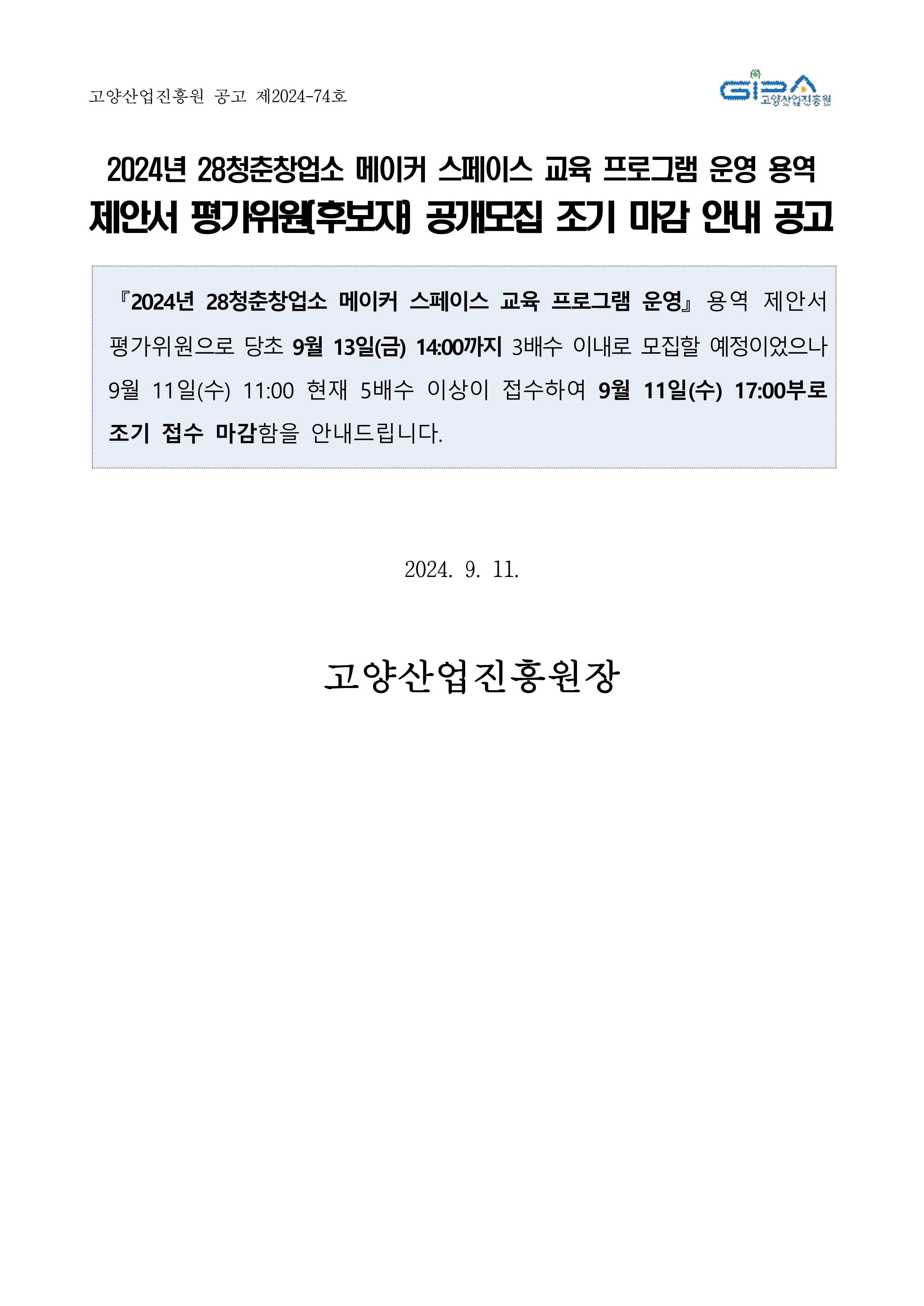 붙임. 용역 제안서 평가위원 모집 조기마감 안내문(2024년 28청춘창업소 메이커 스페이스 교육 프로그램 운영).pdf