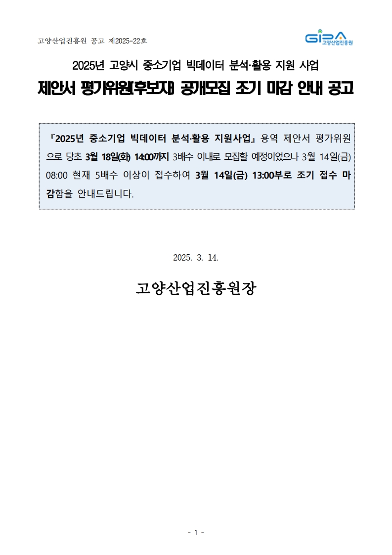 [일반] 「2025년 중소기업 빅데이터 분석·활용 지원 사업」 제안서 평가위원 조기마감 안내문