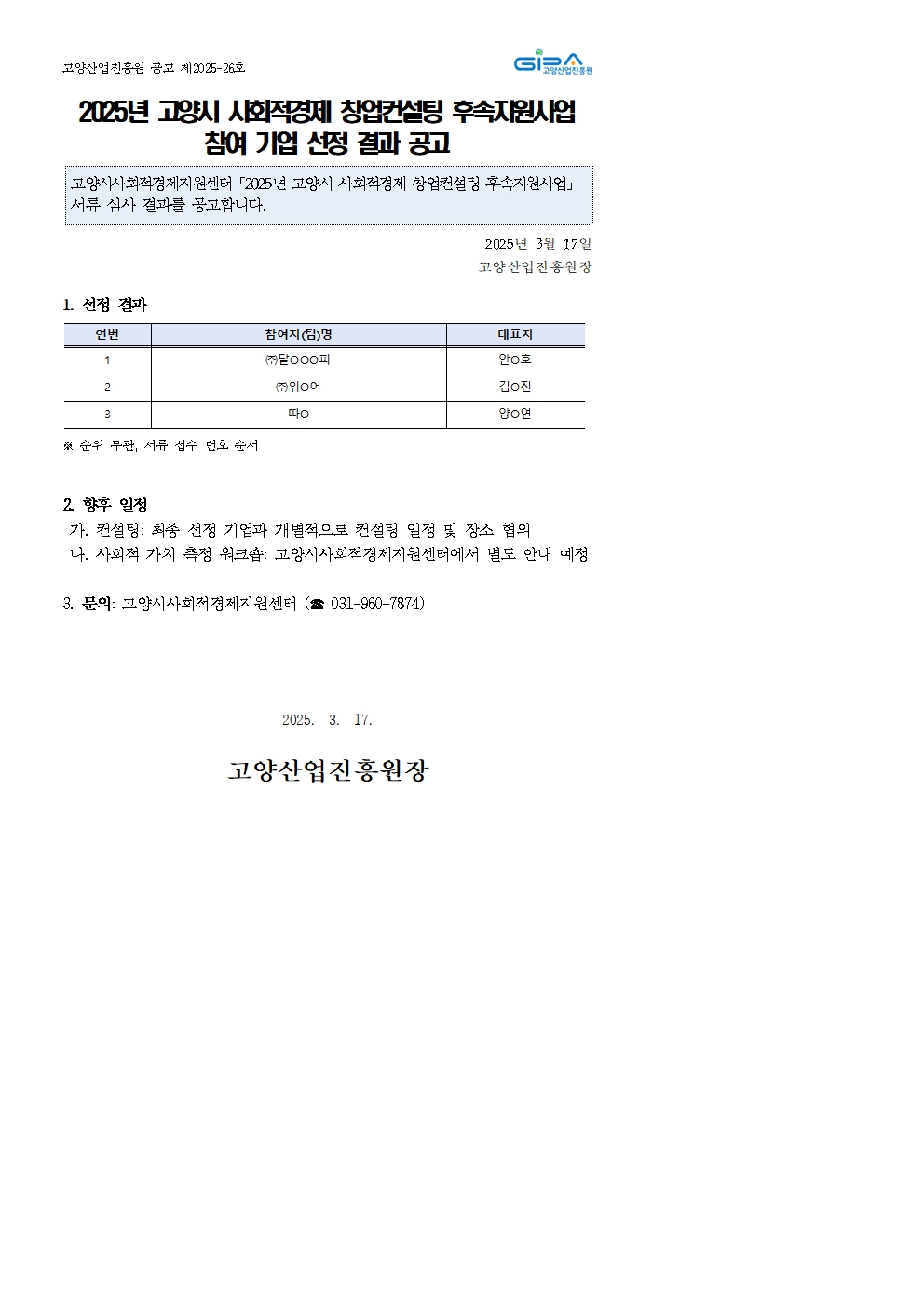 2025년 고양시 사회적경제 창업컨설팅 참여자(팀) 선정 결과