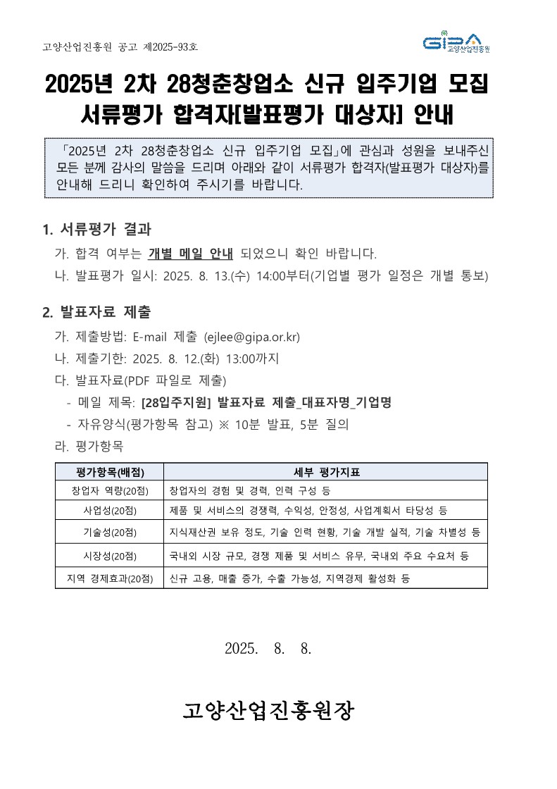 [일반] 2025년 2차 28청춘창업소 신규 입주기업 모집 서류평가 합격자(발표평가 대상자)공고문