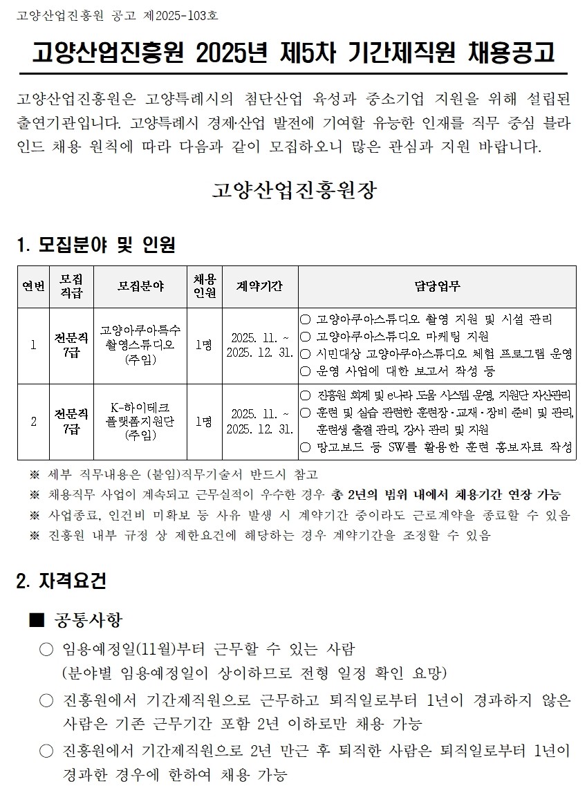 [채용] 고양산업진흥원 2025년 제5차 기간제직원 채용공고