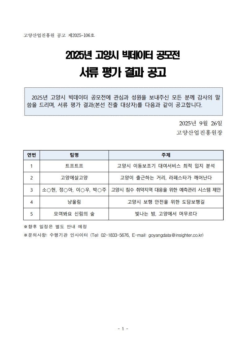 붙임 2025 고양시 빅데이터 공모전 서류 평가 결과 공고문.hwp