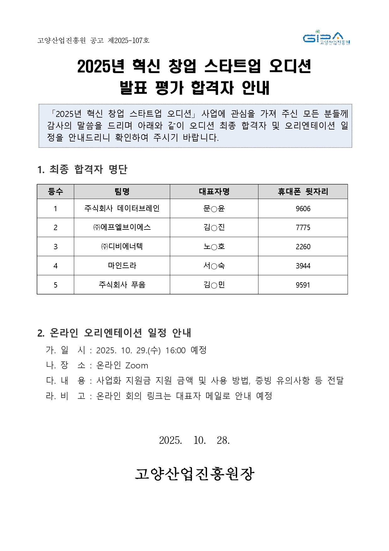 [일반] 2025년 혁신 창업 스타트업 오디션 발표 평가 결과 공지