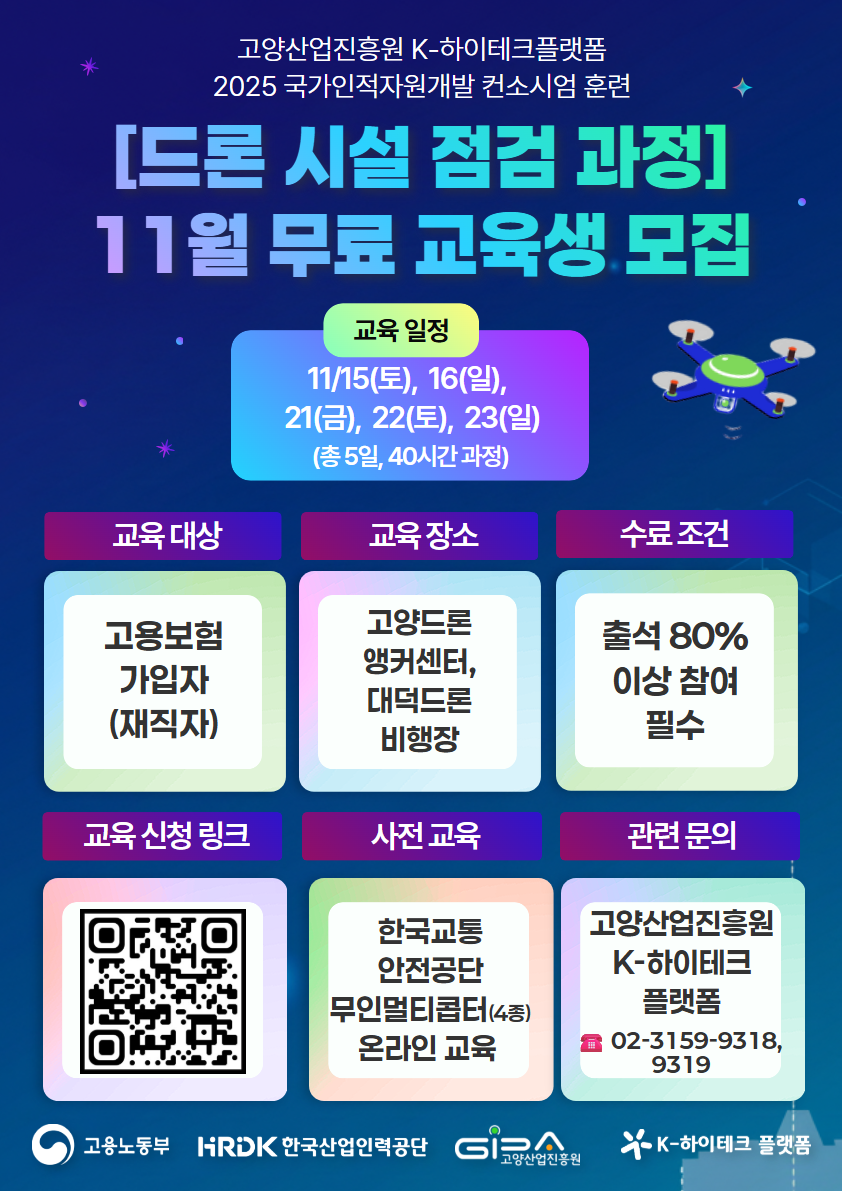 * 고양산업진흥원 K-하이테크플랫폼 교육 과정은 고용노동부, 한국산업인력공단의 사업으로 고용보험 가입자 대상 전액 무료로 진행됩니다.