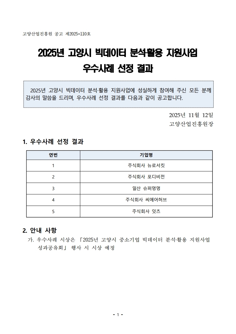 [일반] 2025년 고양시 빅데이터 분석‧활용 지원사업 우수사례 선정 결과 공고