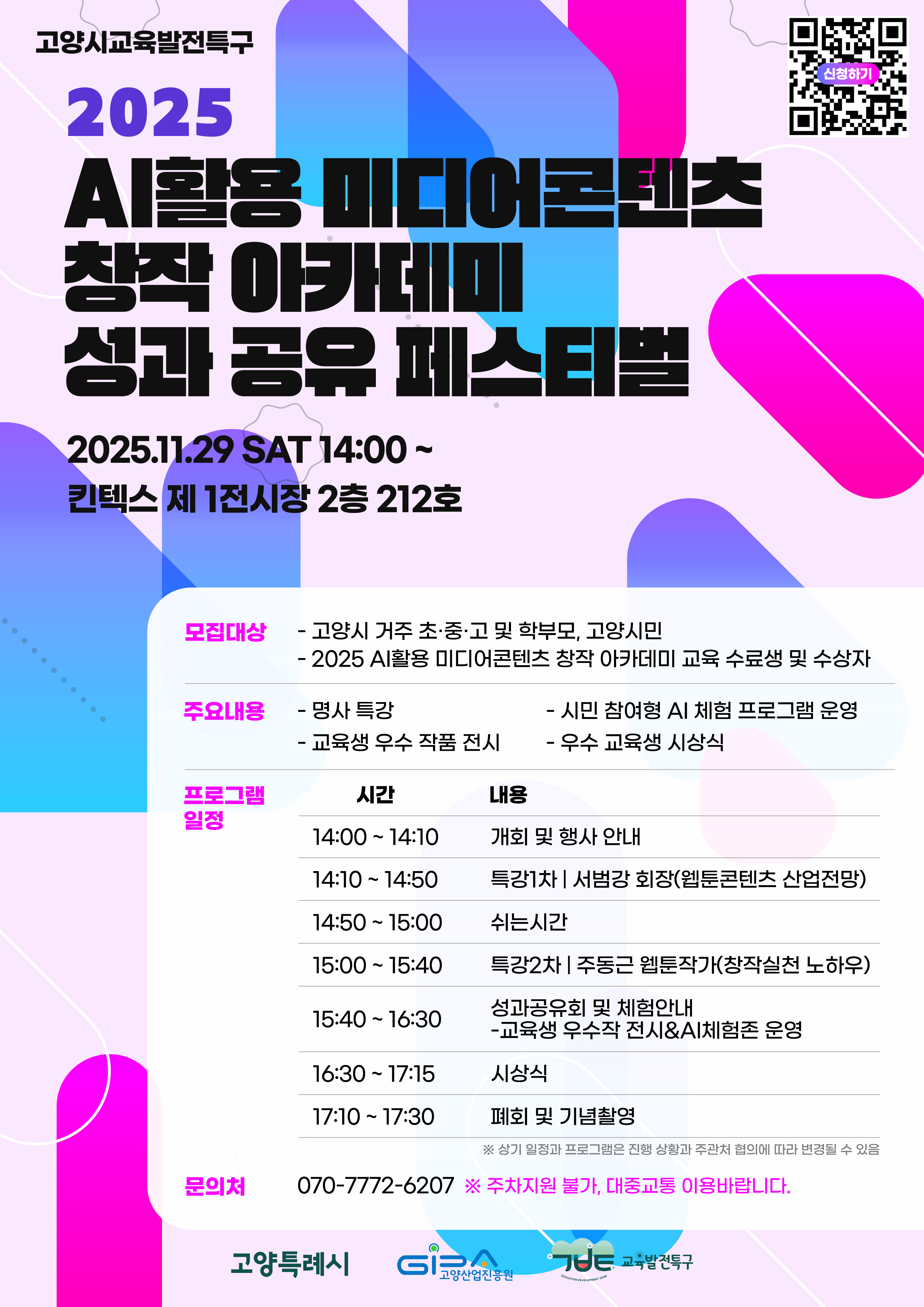 ◇ K-웹툰의 성장과 AI의 영향과 독자들을 사로잡는 웹툰을 만들고 미디어콘텐츠로 확장하는 주제의 "AI시대, 웹툰의 미래를 그리다!" 명사특강도 진행되니 많은 관심과 참여 부탁드립니다.