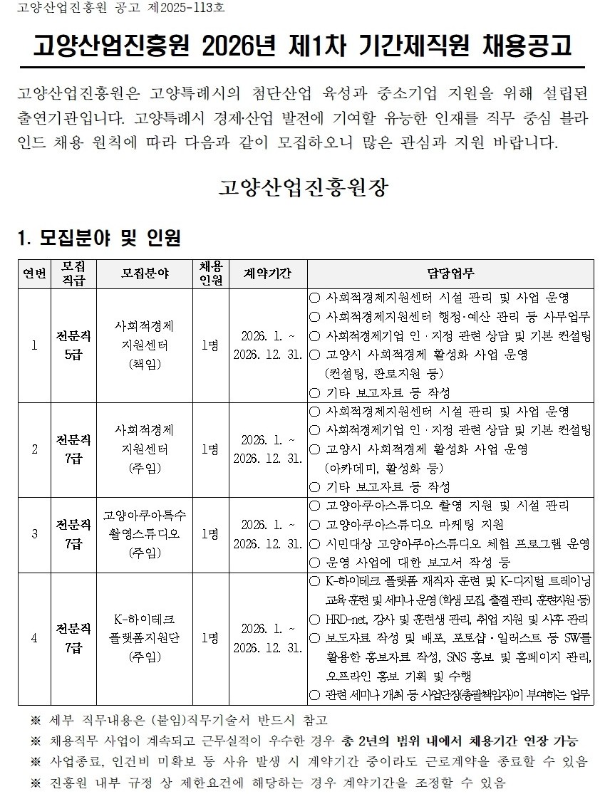 [채용] 고양산업진흥원 2026년 제1차 기간제직원 채용공고
