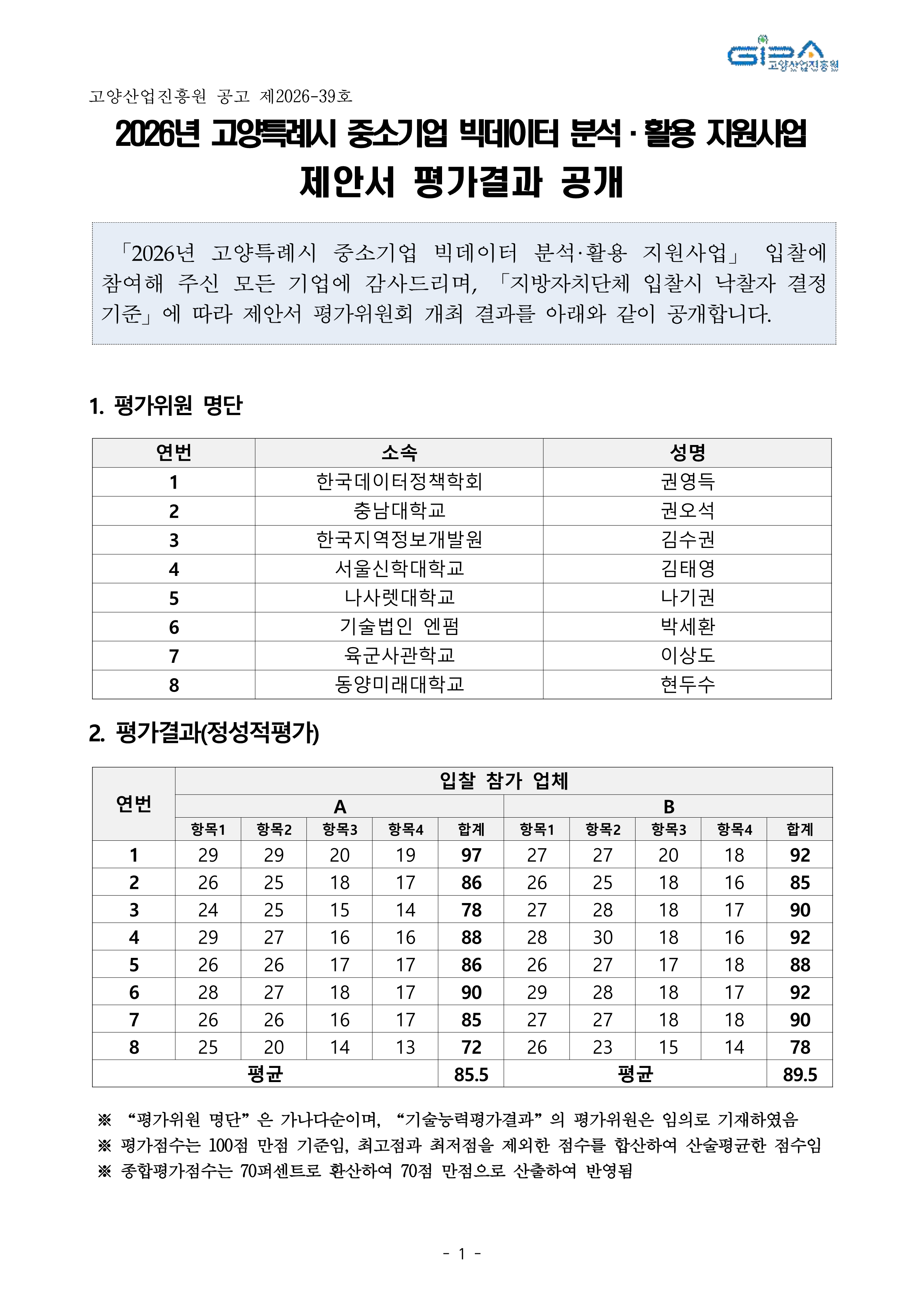 [일반] 2026년 고양특례시 중소기업 빅데이터 분석·활용 지원사업 제안서 평가결과 공개