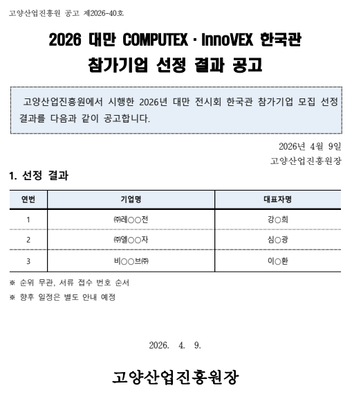 [일반] 2026 대만 COMPUTEX·InnoVEX 한국관 참가기업 선정 결과 공고