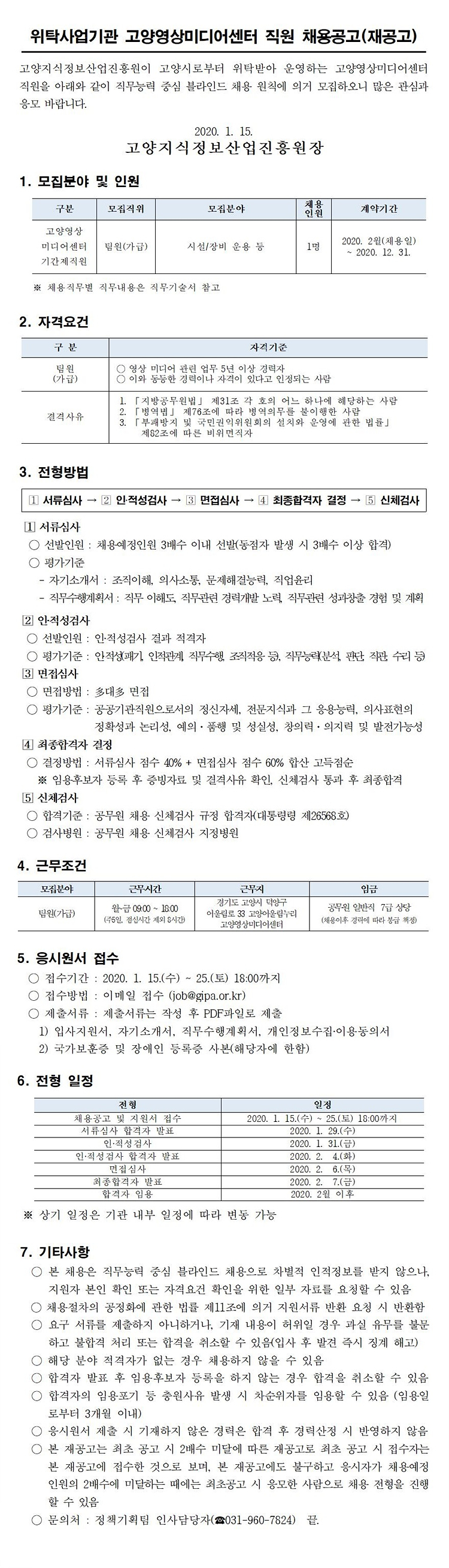 [채용] 고양영상미디어센터 직원 채용 공고(시설/장비운용 등 재공고)