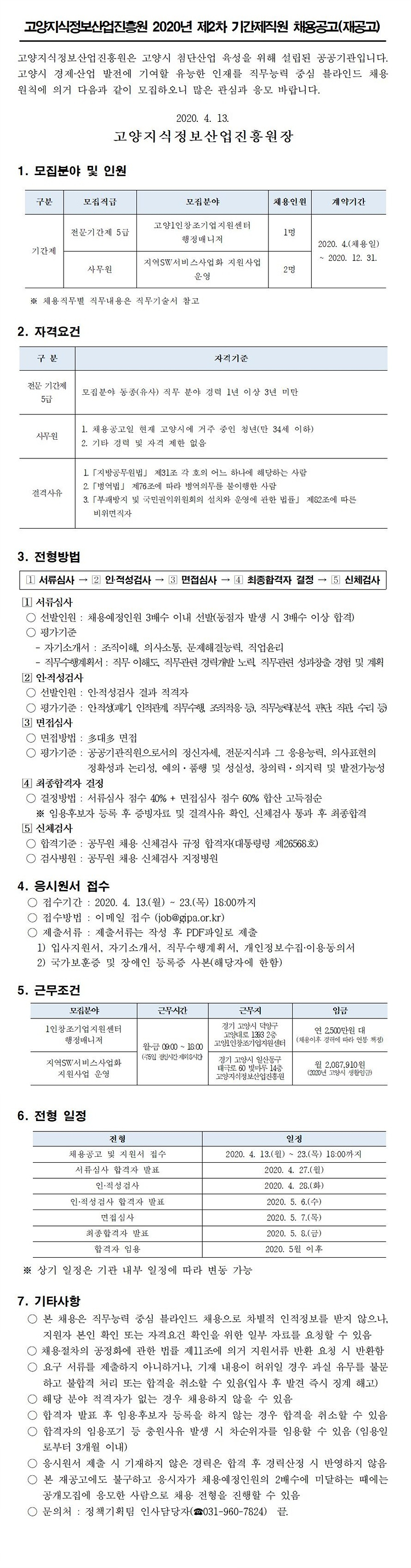 [채용] 고양지식정보산업진흥원 2020년 제2차 기간제직원 채용공고(재공고)