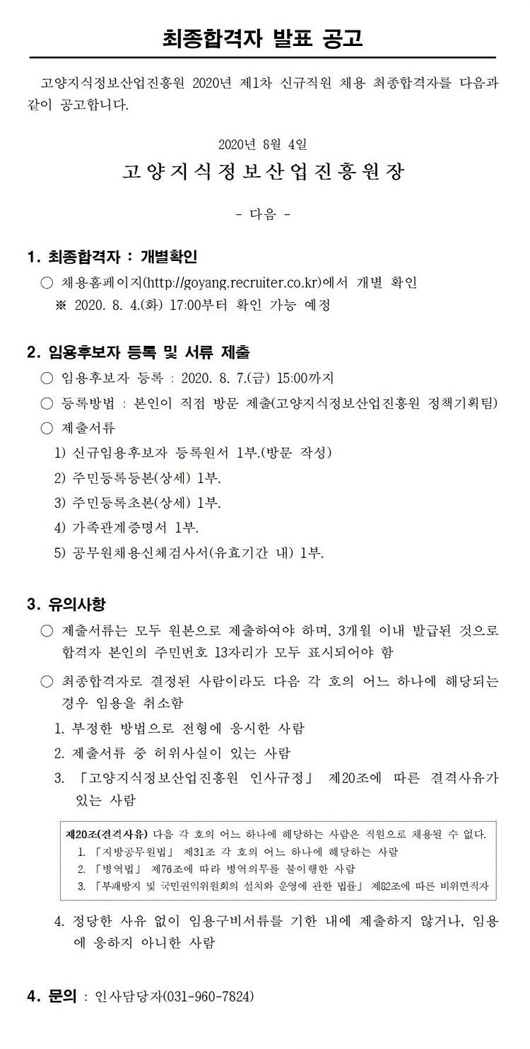 [채용] 고양지식정보산업진흥원 2020년 제3차 기간제직원 채용 최종합격자 발표 공고