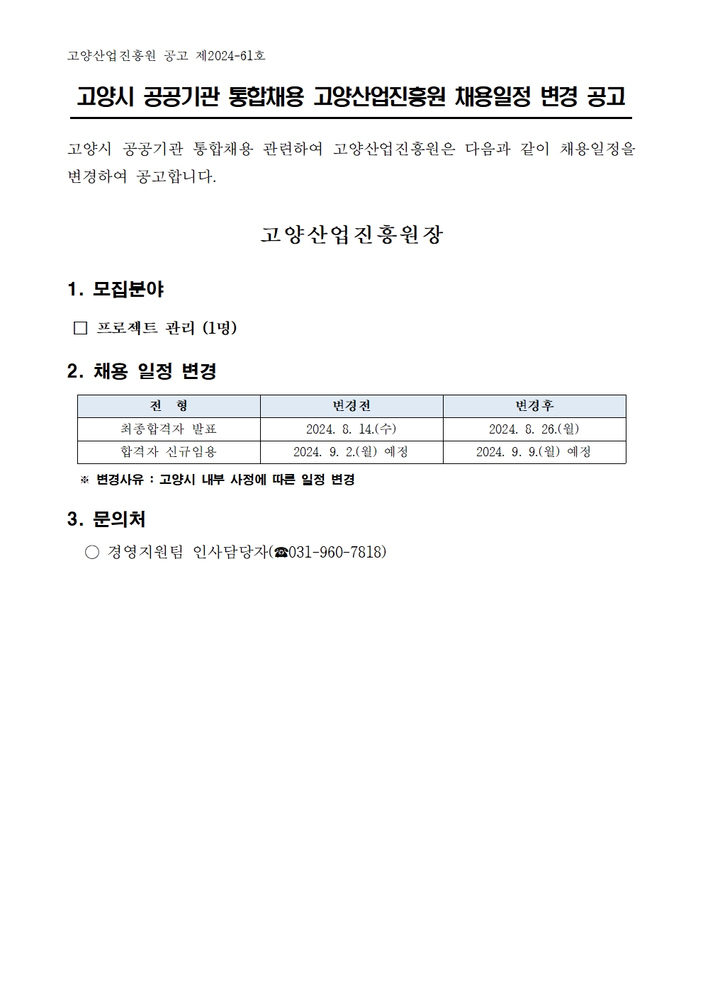 1. 채용일정변경공고문(고양시 통합채용)_고양산업진흥원.hwp