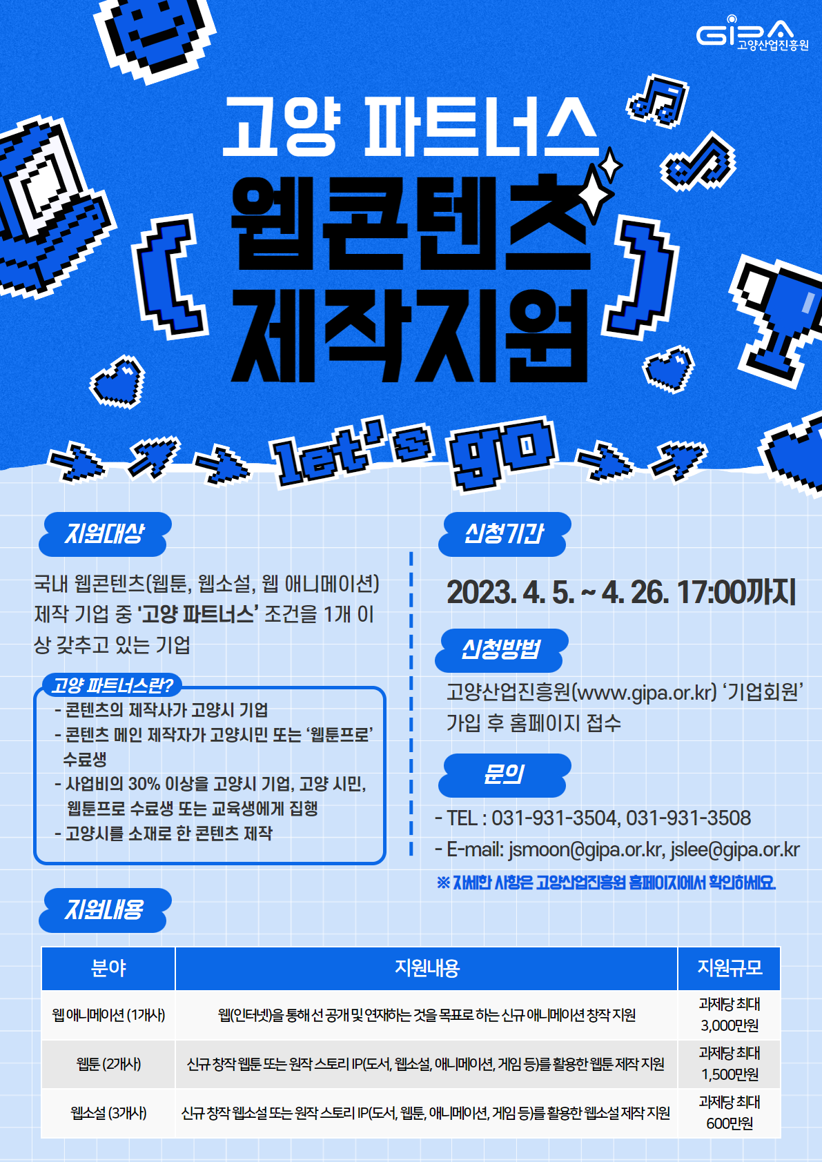 고양산업진흥원(원장 오창희, 이하 진흥원)은 4월 26일까지 ‘2023년 고양 파트너스 웹콘텐츠 제작 지원사업’ 참여기업을 모집한다.